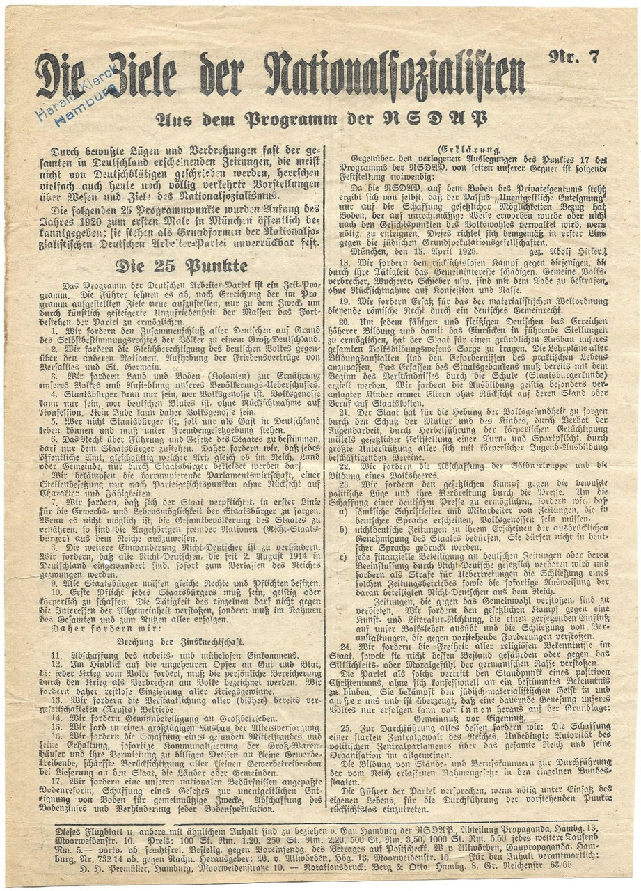 25-punten-programma vand de Nazi-partij, rond 1920. Afmetingen: 28,3 cm x 20,5 cm. Goede staat, iets zeldzamer.