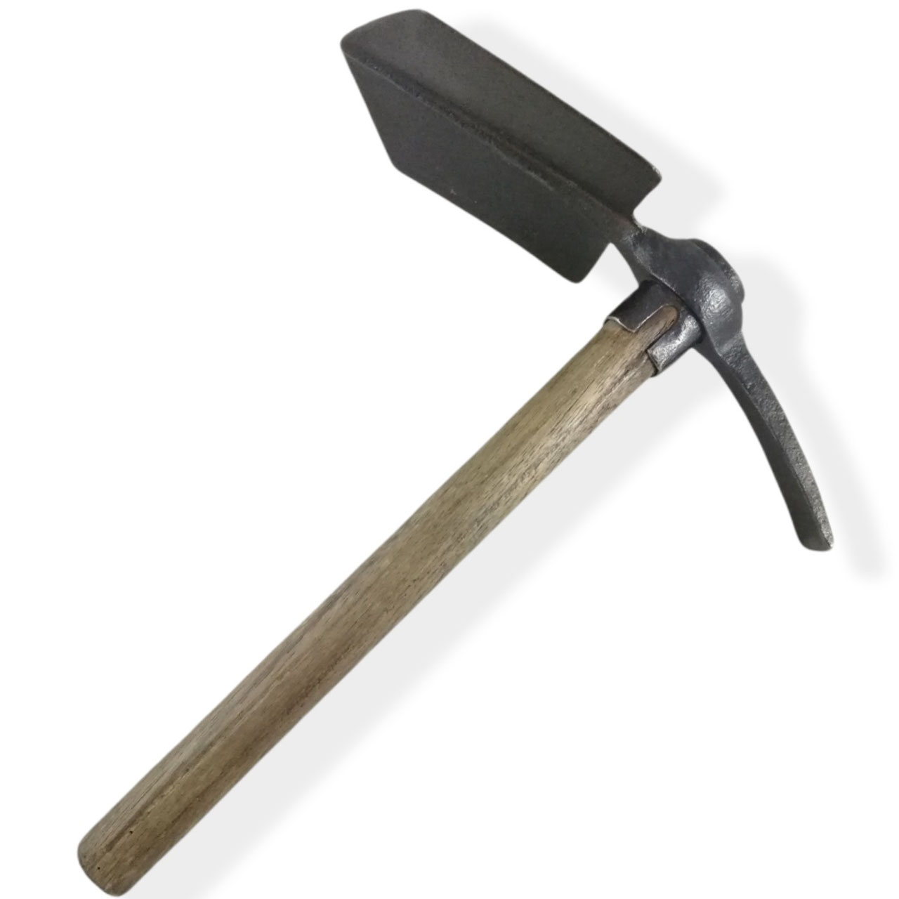 Mooi gemarkeerd. Hout deels gekrompen, enkele gaatjes van houtworm aanwezig (deze niet meer actief). Ijzeren ring welk normaal rond het hout zit, vastgeroest aan het eigenlijke werktuig.