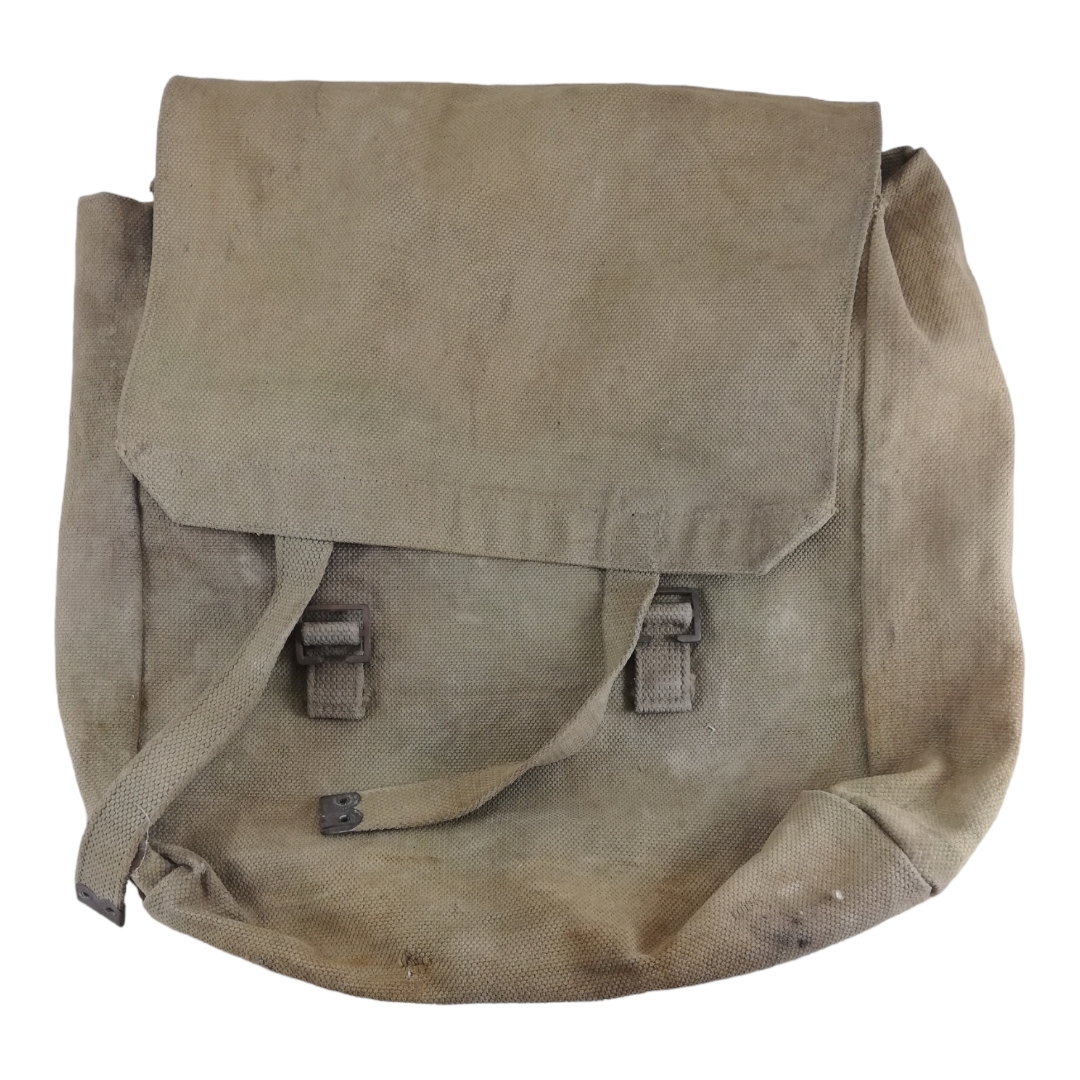 Met maker 'M.E.Co.', gedateerd 1915. /|\ aanwezig. Onder de maker staat een handgeschreven naam. Tas is voorzien van een lederen draagriem (Duitse oorsprong?) welke later werd bevestigd, eventueel voor civiel gebruik.